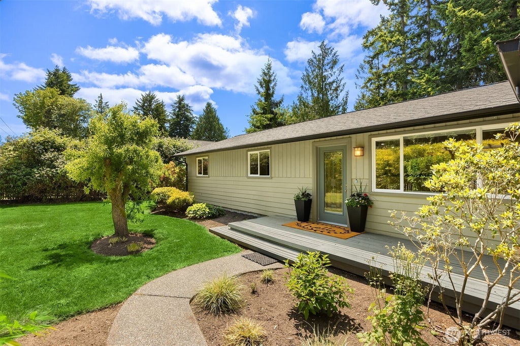 Fabulous 3 BR, 2 BA one level home on an exceptionally private, quiet, and convenient 1/3 acre in the desirable Wing Point neighborhood. Remodeled in 2010, enjoy an open floor plan with French door leading to a sunny private deck. This home has upgraded tile bathrooms and spacious kitchen with newer appliances. Enjoy solid hardwood floors throughout, a main bath that features granite countertops, laundry with ample cabinetry, folding counter & marmoleum floor, plus a primary suite with private bath. Attached garage and additional studio building in sunny, fully fenced backyard with lovely mature landscaping. You'll love living close to the ferry & Winslow amenities, Wing Point golf course, and nearby beach access at Hawley Park.