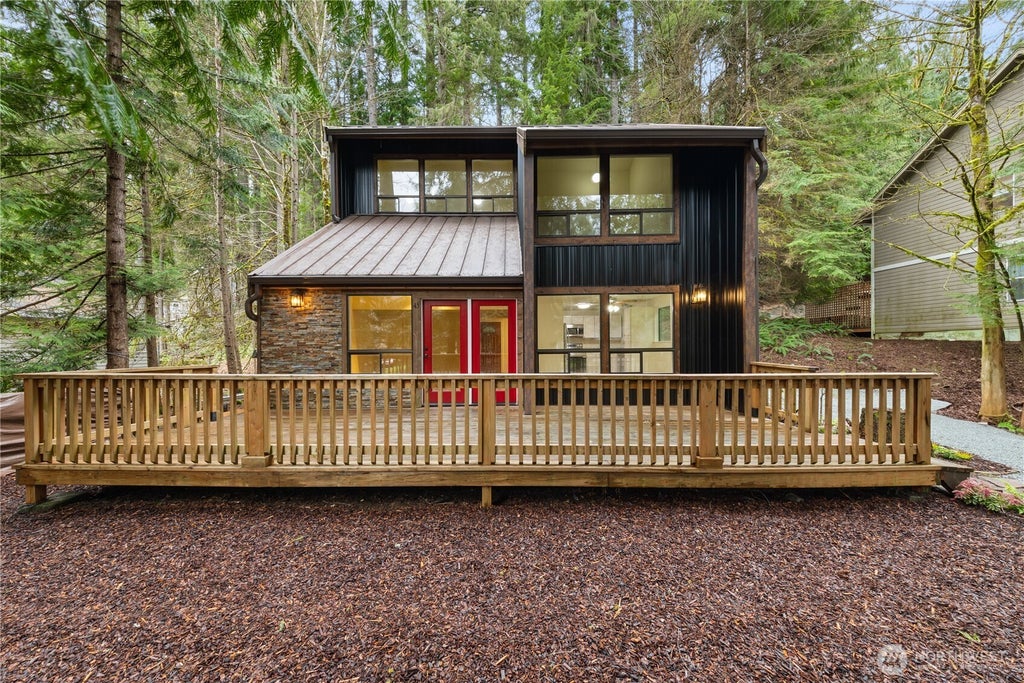 Fully remodeled & stylish, this Sudden Valley home blends modern updates with natural charm. Enjoy luxury vinyl plank flooring on the main level, a dramatic two-story ceiling, & a cozy pellet stove in the living room. The kitchen shines with shaker cabinets & stainless steel appliances. Upstairs offers nook, vaulted bedroom ceilings, & a full bath. Step onto the spacious front deck—perfect for relaxing, entertaining, or soaking in the peaceful surroundings. Recent upgrades include a new roof, metal siding, plumbing, crawl space insulation, and vapor barrier. Enjoy Sudden Valley amenities—marina, boat launch, golf course, clubhouse, pool, parks, & year-round activities! Move-in ready comfort with a touch of mountain charm.