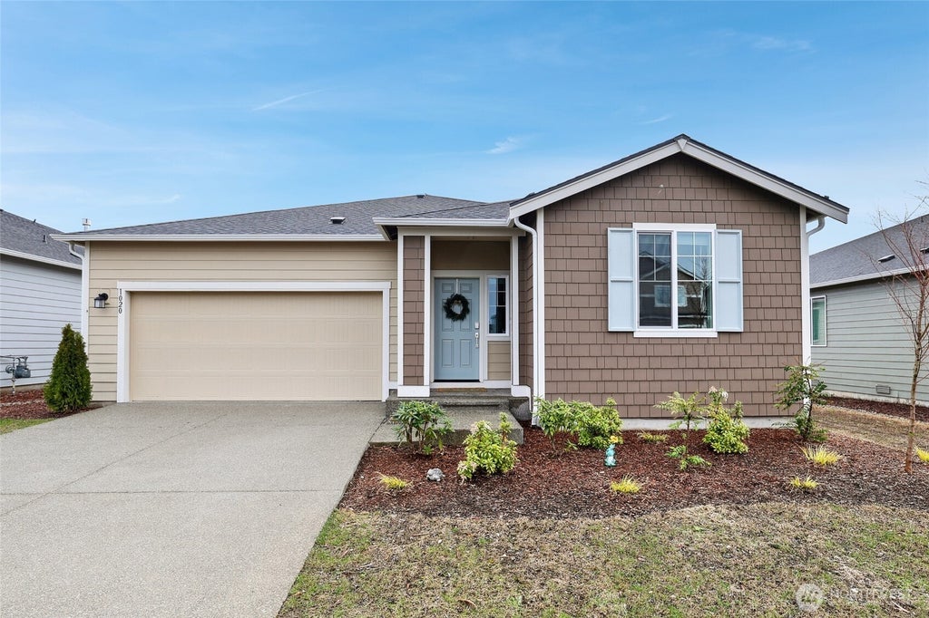 Gorgeous rambler, only 1 year old, feels like new and offers the perfect blend of modern design and comfort. On entry, you're welcomed by bright, open living spaces. Gourmet kitchen features oversized island, stainless steel appliances, beautiful cabinetry, and a spacious pantry & canned lighting. Open concept seamlessly flows into a spacious great room/dining area with slider out to a fully fenced backyard. Bedrooms are generously sized, w/primary suite offering a serene retreat complete w/lovely ensuite featuring a double vanity. Dbl car garage, ample storage, and a wonderful neighborhood with picturesque views of Mt. Rainier.