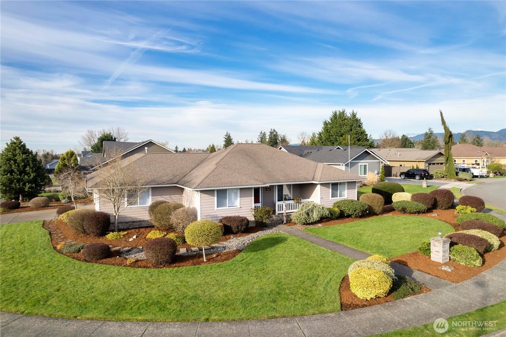 Mt. Rainier views at this 3 bed + den/office, 1.75 bath. 1,790 SF rambler in Buckley! Spacious kitchen w/ SS appliances, dining area, peninsula bar seating, & adjacent formal dining room w/ hardwood flooring. Vaulted ceilings in living room w/ gas fireplace & french doors to back patio. Primary bedroom has WIC & attached .75 bath w/ dual vanity sinks. Spacious den/office/flex room. Full guest bath. Laundry/utility room w/ mud sink & cabinet storage. 2-car garage. Gas furnace w/ A/C new in 2019. Mature & well-maintained landscaping w/ sprinkler system + garden shed. Covered front porch is perfect for enjoying the afternoon sun & views of the mountain + foothills. Don't miss your chance for a great home in a great neighborhood!