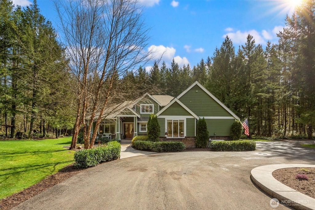 Curtis Lang Craftsman estate sprawls across 5+ tranquil acres in Big Valley’s gated haven! A majestic tree-lined drive unveils a sage-green masterpiece framed by towering evergreens. Soaring double-height ceilings highlight intricate millwork & bespoke built-ins paired by natural stonework. Arched windows flood the family room with lush vistas off a gourmet kitchen with rich cabinetry and sunny nook. Lavish Main floor Primary suite w/fireplace, spa-like 5-piece bath, vast walk-in closet & lush private patio views. Elegant living, dining, professional office w/entry garden views, & utility rm. Upstairs: 3 beds, full bath & bonus retreat. Energy efficient Geothermal heating/AC. Savor Ravensdale’s calm, yet close to shopping & amenities.