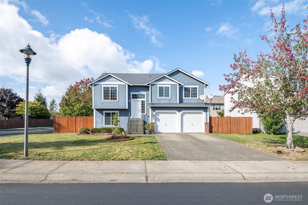 New price! Beautiful 5-bedroom 3 full bath spacious home that is move-in ready. All solid surface hardwood and laminate floors up and down. Spacious kitchen with an abundance of cabinets and granite counter tops. Upstairs full dining and living room, gas fireplace, kitchen with eating nook, 2 full baths and 3 bedrooms. Sliding glass door to a large deck. Downstairs has a warm spacious family room, 2nd gas fireplace, 2 bedrooms w/3rd full bath. Sliding glass door opens up to the patio and fully fenced backyard that is level and low maintenance landscaping with garden space on a large corner lot. New furnace installed in Nov 2023. 2 garage door openers w/keypad & remote. Close to shopping, restaurants, & JBLM.