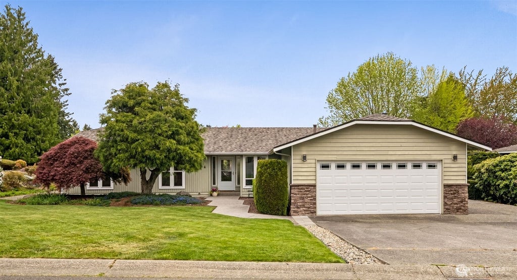 MERIDIAN VALLEY COUNTRY CLUB RAMBLER! A true single story, Open Concept Home with 3 spacious bdrms + Designated Office with French Doors situated on a meticulously manicured Premium sized lot in a gated, 24/7 guarded community. Great gathering spaces and Beautifully Updated, this home features an oversized Granite Island kitchen, white cabinetry, stainless appliances, Gas Cooking, bev refrig, spacious Great Room accessing additional entertainment space outdoors on the patio with gorgeous landscape surrounds. PLUS primary ensuite with heated floors, oversized shower, a 50-year Presidential Roof, Closet Systems, jetted tub, Sport Court, generous off-street parking & attic storage. Golf course amenities available w/MVCC membership. Must See!