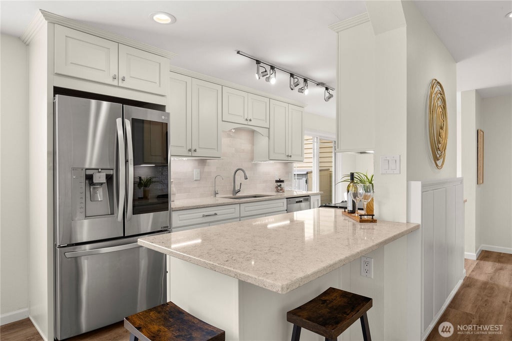 Beautifully updated 3 BR, 1.5 BA townhome in the highly sought-after Riverstone community in Bellevue. The main level features an open layout with luxury vinyl flooring throughout, a modernized kitchen with quartz countertops, ample storage, and updated appliances. Enjoy two private patios, perfect for outdoor relaxation or entertaining. Upstairs, you'll find three generously sized bedrooms and a full bathroom. An abundance of natural light fills the space. Comes with two assigned parking spaces and is conveniently located just minutes from MSFT, I-90, DT Bellevue and steps to the school, parks, and shopping. HOA dues cover water, sewer, and garbage. Zoned for the award winning Bellevue School District. No rental cap!