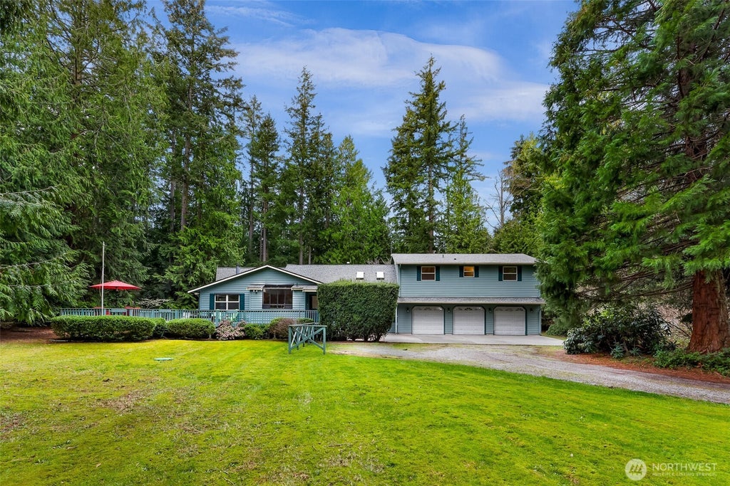 Nestled among mature evergreens, this classic custom home offers a serene retreat on level acreage. The main level features a spacious primary suite with a walk-in closet, a guest bedroom, a den, and open living, dining, and kitchen areas. A large 700+ sq. ft. deck provides the perfect space for entertaining. Upstairs, a private guest wing includes two bedrooms, a family room, and a bath. Recent updates include a whole-house generator, new water softener, water heaters, energy-efficient lighting, and high-speed fiber internet. A 3-car garage with a workshop adds versatility. Just minutes from Maxwelton Beach and Hwy 525, this home blends comfort, convenience, and tranquility.