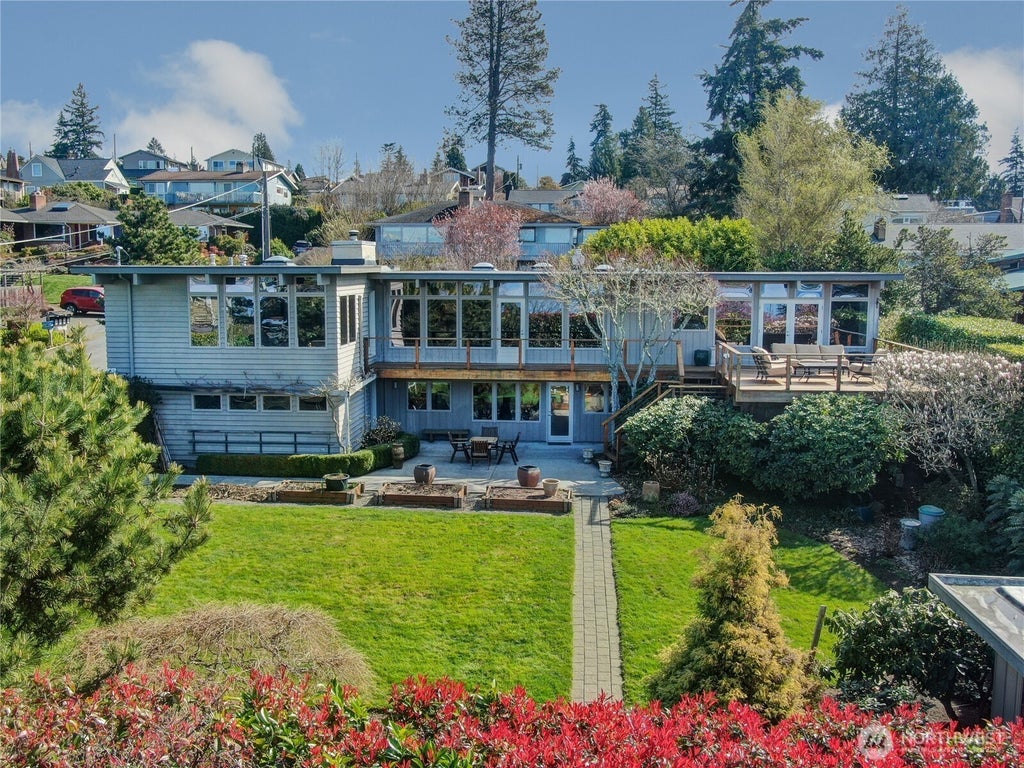 Enjoy an extraordinary Richmond Beach home on a quiet cul-de-sac updated in systems, structure and style with gorgeous views of Puget Sound and the Olympic Mountains. Featuring a gracious and expansive living room and dining room and an open, remodeled kitchen with easy access to a sizeable back deck with stunning perspectives - an unmatched opportunity for indoor outdoor entertaining. In addition, the home provides 4 bedrooms, 3 bathrooms - including a very large primary suite with a 5-piece bathroom and walk-in closet, a main floor family room, a daylight lower level recreation room with access to the lower patio and the large, private back yard & gardens with a detached studio, a huge 2 car garage and workshop, laundry, and ample storage