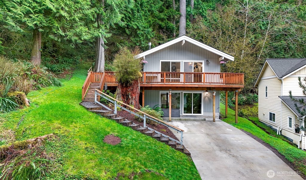 Meticulously maintained Sudden Valley home in Gate 2. Sunny location and just a short walk to Lake Louise. Updated cabin style with vaulted ceilings, wraparound deck & great natural light. Main floor offers bright kitchen w/ white cabinets, stainless steel appliances, open living/dining, plus 2 bedrooms & full bath. Downstairs: expansive primary suite w/ gas fireplace, 3rd bedroom, bonus flex room & ¾ bath. Flexible layout w/ potential for 2nd living space, home office, gym & more. Fenced yard ideal for pets. Move-in ready & full of charm! Vibrant community includes pools, gym, golf, trails, Lake Whatcom access & more.