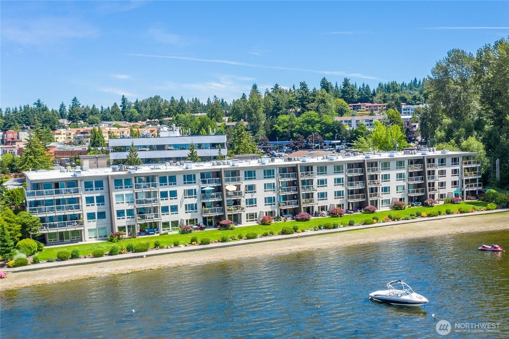 Come back and see the updates! TOP FLOOR Unit w/skylights & 180 degree lake views from both inside unit and deck! Brand New Bathrooms w/stylish, modern finishes/fixtures, Updated Kitchen w/beautiful maple cabinets, tons of counterspace, two eating bars & wine fridge! New Closets too! Large laundry room - washer & dryer included & plenty of room for adding storage! Brand new gas fireplace w/temp-control remote - gas paid by HOA! Newer HVAC, water heater, carpeting, paint, and millwork too! 300-ft private beach, buoy moorage, & 2 parking spaces (one in garage), gated access, elevator, & pool! HOA dues include Xfinity internet + cable pkg. No rental cap, no assessment, pet friendly (2 max). Located next to Juanita Village and two parks!