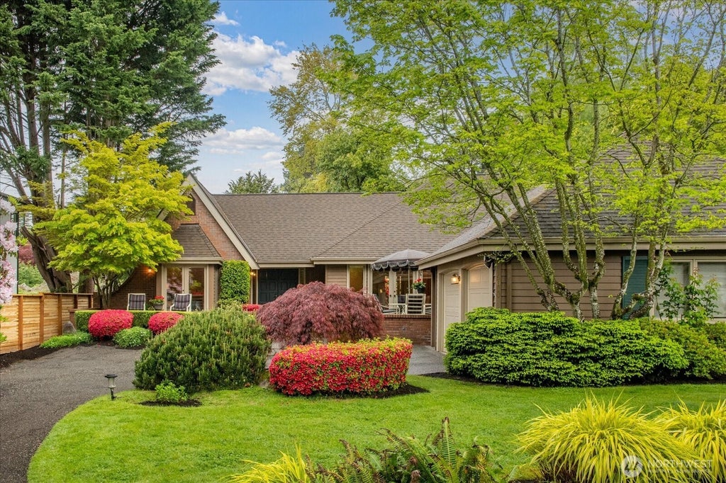 Lovely rambler with breathtaking mature landscaping located on a private cul de sac within walking distance to DT Bellevue. Ready to downsize, but not ready for a condo? This is the home for you. Separate dining room adjacent to the gracious living room with fireplace make entertaining easy. Built ins store your entertaining needs. Spacious primary bedroom with French doors leading to the front patio, multiple closets and large walk in shower make this a lovely retreat when you are home. Huge 2 person home office with wet bar and built ins that offer tons of storage. Ensuite guest suite finishes out the home that you can easily lock and leave.
