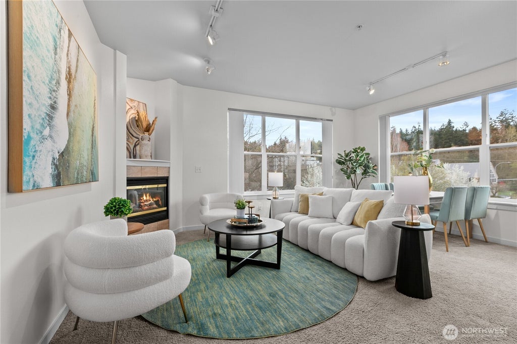 This exceptional bright corner-unit condo is nestled in the vibrant heart of downtown Redmond. Boasting a generous 2-bedroom, 1.75-bathroom layout, the home features an expansive open floor plan with large windows and plenty of natural sunlight. High ceilings, a cozy fireplace, and a built-in desk enhance the space, while the kitchen is ideal for entertaining with its maple cabinetry, breakfast bar, and stainless steel appliances. The master suite offers a private bath, walk-in closet, and French doors leading to a Juliet balcony. 2 assigned parking spaces in the secure gated garage & elevator. Located across village square cafe, walking distance to library,restaurants,shops, bus stop and light rail station. NO RENTAL cap and PRE-INSPECTED!