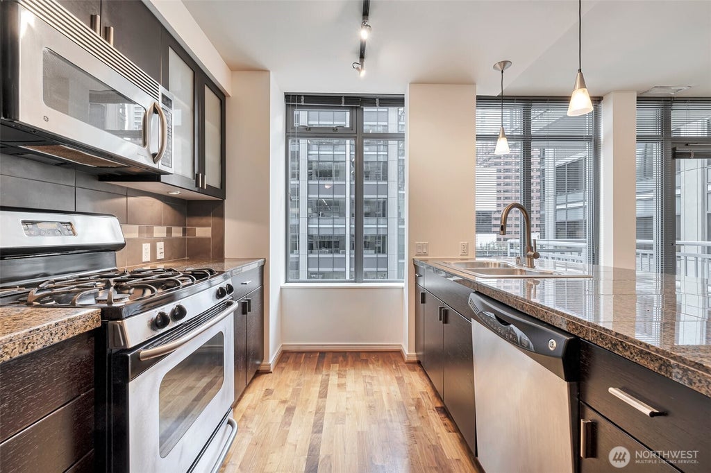 Floor to ceiling windows in this bright corner unit. Lovely plaza views. Updated kitchen with modern appliances. Washer and dryer in the unit. Balcony with city views. Spacious community room for entertaining. Large business center. Exercise room with sauna and jacuzzi just down the hall. Guest suite for visiting friends and family available for reservation. Expansive park-like roof top deck with city and Lake Union views. Underground secured parking and reasonably sized storage room on the same floor as the parking spot. 24 hour concierge. No rental cap.