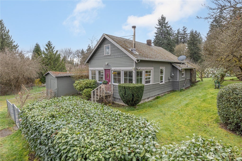 Adorable 1910 cottage on a BIG level and usable lot. Near acre provides room for lots of possibilities. Front half acre: fully fenced, cottage is a 2/1 with great southern facing back deck and gazebo, fruit trees, and outbuildings. Back half acre is untouched and ready for your ideas. Move in and live in the cottage as is or make it an ADU to future build. Cute, quaint, country living but in a great location with quick access to 512, Puyallup, Tacoma, & JBLM. Close to schools and parks. Come check it out!