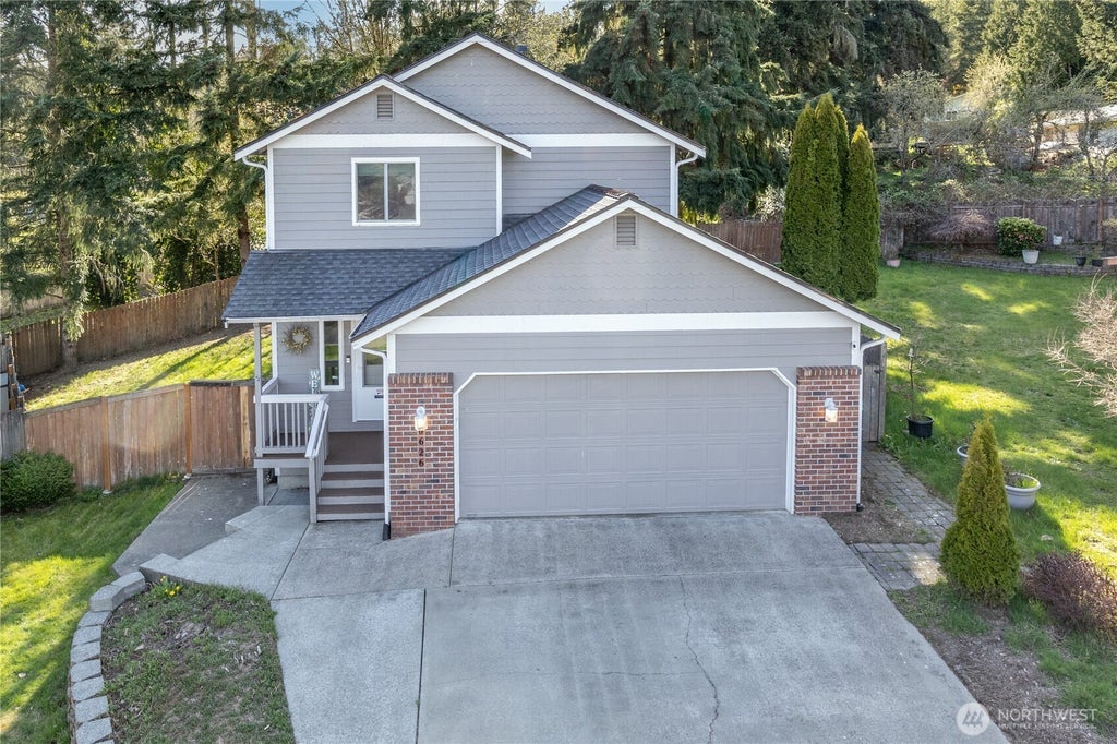 Welcome to this inviting 3-bedroom, 2.5-bath home tucked away in a quiet cul-de-sac on a dead-end street—offering both privacy and convenience just 10 minutes from Kitsap Mall, Costco & in desirable CK School district. Luxury vinyl plank flooring flows through the main level, adding warmth and style. The kitchen is perfect for cooking and gathering, featuring generous counter space, a gas stove and a seamless connection to the adjacent dining area. From here, a sliding door opens to a spacious wrap-around patio—& large yard complete with privacy fencing, trees & ambiance lighting, ideal for relaxing or entertaining. 3 large bedrooms and two full baths fill out the upstairs. With plenty of space and privacy, this house easily becomes a home!
