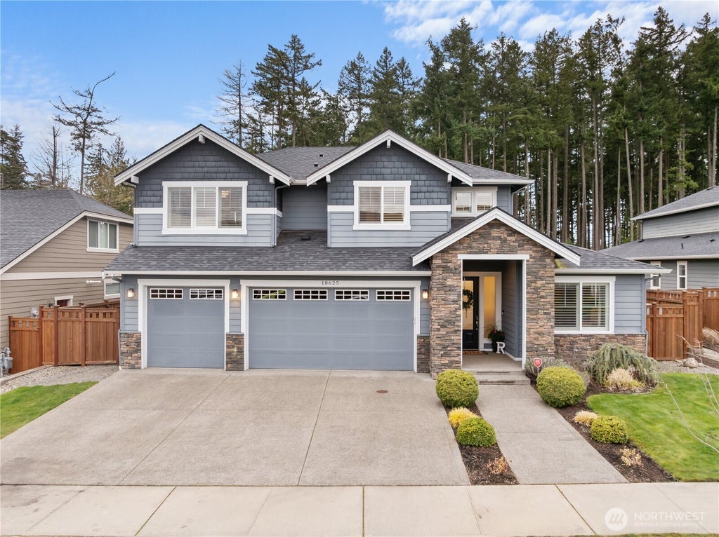 This HC resale is upgraded & ready for its new owners. Featuring over 3400 sqft of luxury & designer upgrades, you will be wowed the moment you walk in. 20ft vaulted ceilings with designer chandelier will charm you for years to come & bring in natural light on those dark PNW days. Beautiful kitchen with custom cabinet pullouts, new fixtures, & a stunning walk in butlers pantry complete with sink make this a chef's dream! Oversized sliders to your covered porch perfect to entertain while watching the sunset peak through the trees. Primary on the main, JR suite on the main, 3 bedrooms + bonus room up. 3 car garage, fully finished with epoxy floors. Elusive large greenbelt lot on THE premier Tehaleh street. AC, sprinklers, too much to list!