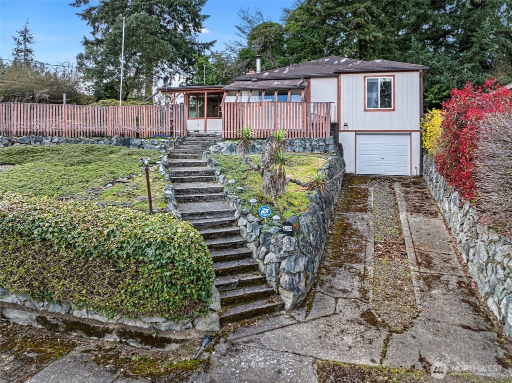 Sitting on a rare double lot, this home boasts breathtaking water and mountain views and is ready for your personal touch. The oversized living room features a wood-burning fireplace, while the generous kitchen and dining area flow into a bright sunroom—perfect for soaking in the scenery. Main floor offers two spacious bedrooms, while downstairs includes bedroom, bonus rooms, a rec room (pool table stays!), and plenty of extra space. Outside, you'll find a covered patio, single-car garage, ample parking, garden area and a storage shed. This is an as-is estate sale, but with a little sweat equity, this gem will truly shine. Don’t miss the opportunity to make it yours! **MULTIPLE OFFERS H&B DUE SUN 9PM W/48 HR EXPIRATION FOR ATTORNEY REVIEW*
