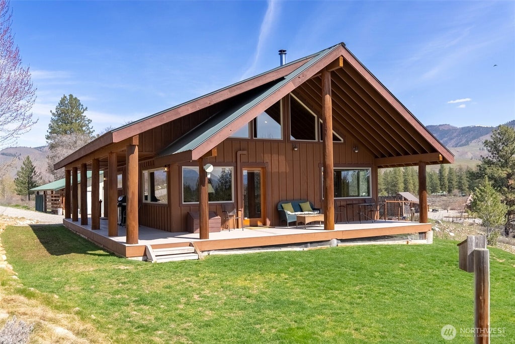 Relax to the sounds of the river from this South-facing home. Expansive river & mountain views! Enjoy your morning coffee on the inviting covered deck. Property consists of 5.25 acres w/ walking trail down to 200-feet of level low bank Chewuch River frontage w/ a great fishing hole. 2 tax parcels w/trails. Classic Methow designed home w/ board & batt siding, pine cathedral ceilings, wood stove on river rock hearth, updated granite counters, bathrooms &appliances, pine-slab kitchen eating bar. Other features include a spacious mudroom with a large sink, newer mini-splits for heating & cooling, irrigation water rights, fenced garden, partially fenced, oversized 2-car garage for outdoor gear & dog kennel, minutes from Winthrop & valley trails.