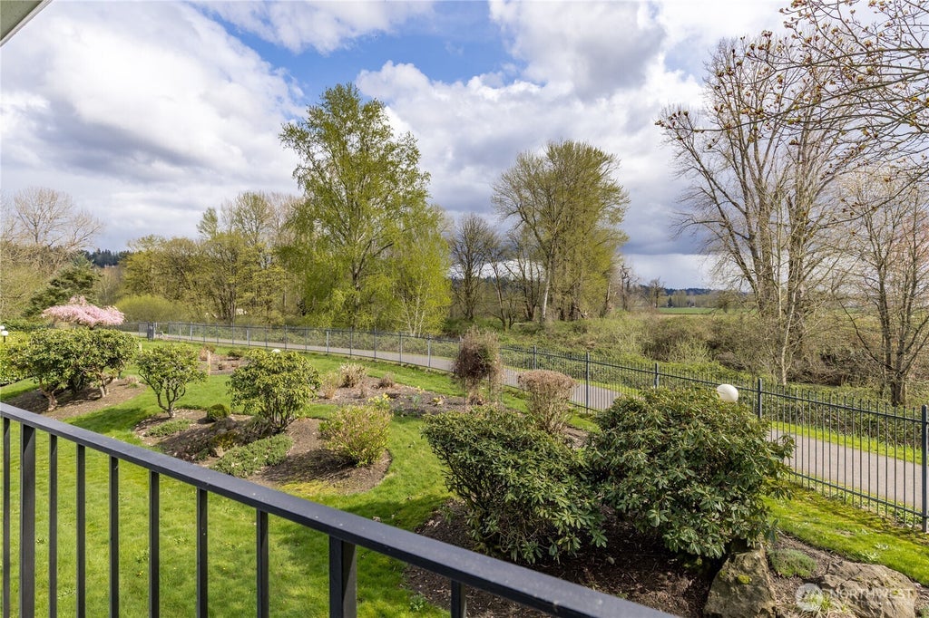 This top-floor end unit has one of the best views in the complex overlooking the Green River and well-maintained grounds, plus a partial Mt Rainier view! The thoughtful floor plan includes a living room with vaulted ceiling, built-in shelving, wood fireplace, and mounted TV that stays with the home. Spacious kitchen has updated appliances and plenty of cabinet space. The primary bedroom features a generous walk-in closet. Full bathroom features a custom nook for extra storage. Full-size washer & dryer stay. Step out onto your covered private balcony year-round to enjoy the natural scenery, or take advantage of the adjacent Green River trail for a scenic walk or bike ride. Great location close to Kent Station, shopping, transit & freeways!