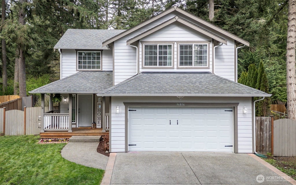 Welcome Home! This beautifully updated 3-bed, 2.5-bath home features a remodeled kitchen, a herringbone backsplash, and crisp white cabinetry. You’ve got options—cozy up by the custom fireplace or enjoy the charm of a built-in library wall in the front room. Bonus room with closet could be used as a 4th bedroom. Fresh interior paint, newly painted front and garage doors, a stylish laundry space, and spacious rooms offer both style and comfort. The private deck off the primary bedroom adds the perfect retreat. Outside, enjoy a fully fenced oversized yard with forest views and a covered patio—ideal for relaxing or entertaining. Convenient to parks, shopping, dining, and an easy drive to JBLM.
