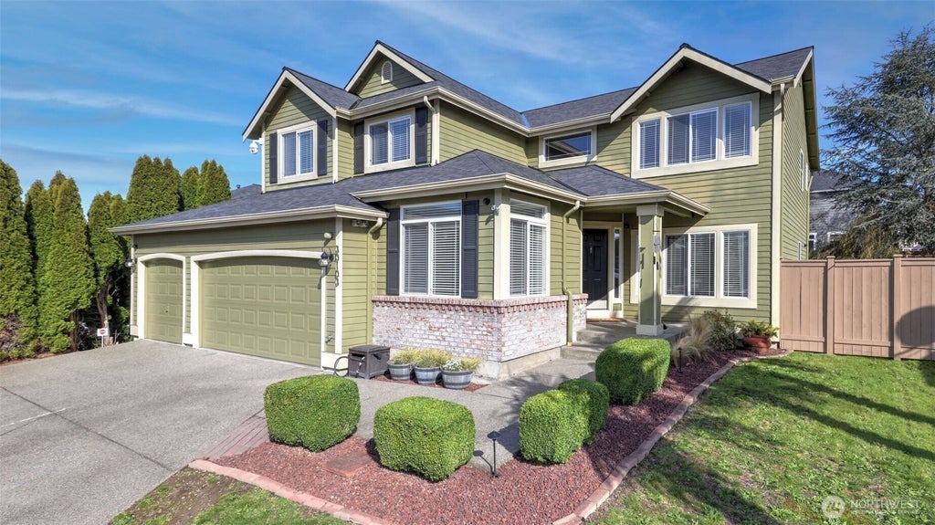 Nestled in Vintage Hills, this stunning 5-bedroom home sits on a serene cul-de-sac and offers a versatile floor plan! Recent upgrades include a newer roof, furnace, and water heater. Enter to gleaming wood floors and soaring ceilings, with a den featuring French doors. The kitchen overlooks the backyard and flows into a cozy family room with a gas fireplace. A main-level bedroom and adjacent 3/4 bath double as an ideal second office. Upstairs features a bonus room, 3 bedrooms, and a luxurious primary suite with en suite bath and walk-in closet. Enjoy a spacious 3-car garage and A/C! Close to schools, parks, trails - don't miss it!