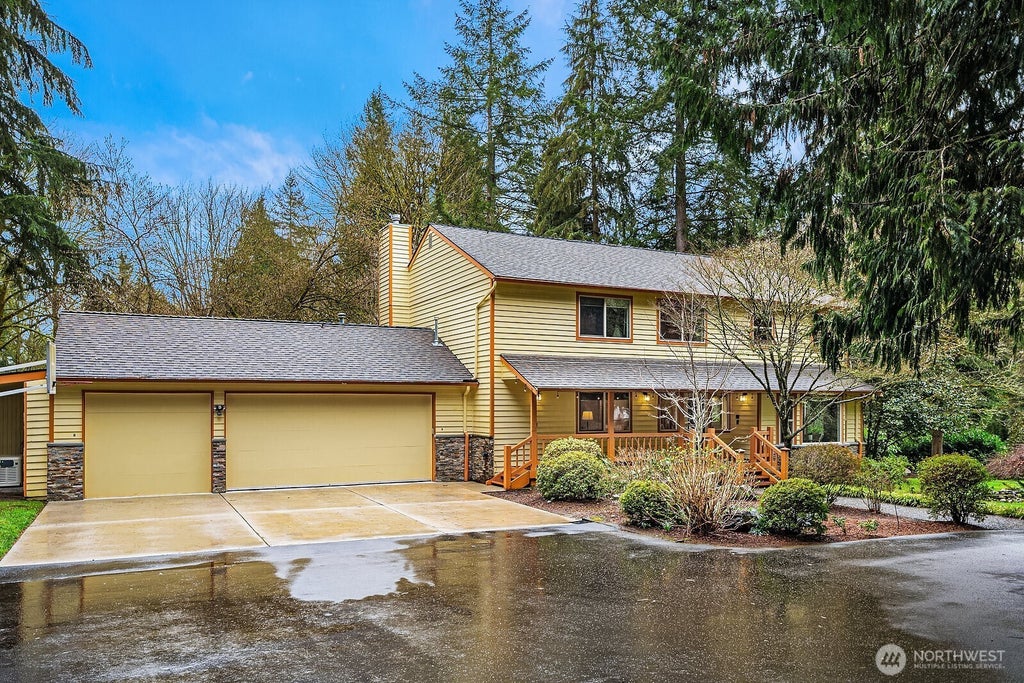 Welcome home to this stunning 2-acre property! This 3-bed + office home has a large open kitchen w/ stainless appliances & an amazing deck. The main level has two living areas, office, kitchen, dinning, laundry & 1/2 bath. Upstairs has an oversized primary suite w/ remodeled bathroom, walk-in closet & upper deck access, plus two more bedrooms & full bath. Full-house gas standby generator & new carpet. Nestled on a large, usable, beautifully landscaped lot, this home offers a wealth of outdoor features, including a firepit, fruit trees, a greenhouse, & more! 3-car oversized garage plus covered RV parking. Pre-inspected & move-in ready!