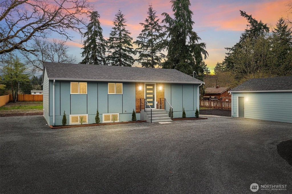 Nestled on a large, level lot, this beautifully renovated home offers modern aesthetics & classic comfort. The sought-after open-concept seamlessly marries the airy living & dining spaces. Gleaming kitchen features sleek two-toned cabinetry, huge island, SS appliances & custom tile backsplash. Cozy electric FP is illuminated by full-height tile surround & wall sconces. Slider leads to generous patio—perfect for entertaining. Primary suite boasts attached ¾ bath w/custom walk-in tile shower, while 2 addt’l bedrooms share a chic full bath. Detached 2-car garage, sizable pergola, massive unfinished basement, side parking for RV, & sewer connection round out this unique property. Possibilities to explore building a shop, DADU, & subdivide!
