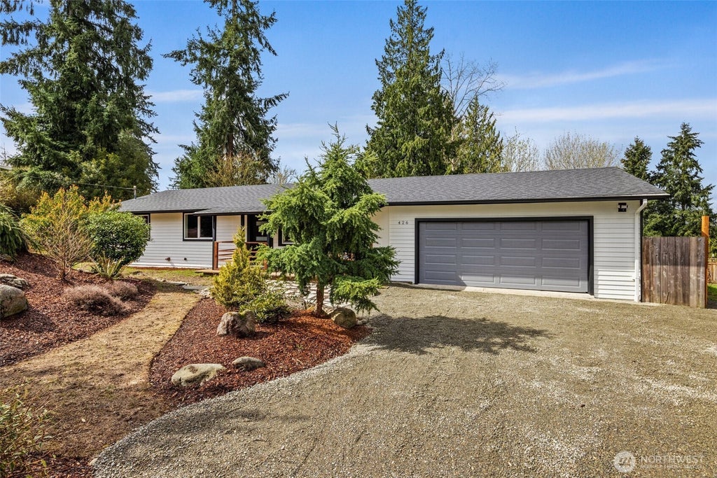 Absolutely stunning 3 bed 1 bath 1,056 sf remodeled rambler w/gorgeous modern finishes! This truly special residence is nestled on an impressive beautifully landscaped .57 acre lot complete w/raised garden beds, patio & 2 decks perfect for entertaining, gardening, pets & relaxation! Plenty of space for hobbies & more! Open & flowing light filled floor plan boasts great room w/new cozy electric fireplace, luxury vinyl plank flooring, recessed lighting, gourmet kitchen w/new cabinetry,quartz counters, new ss applcs, dining & access to sunny backyard. Large primary suite w/private deck & 2 addl beds, a remodeled full bath w/vanity,quartz counters,tub w/tile surround & new lighting.New roof! Oversized 576 sf 2 car garage, driveway & RV parking!