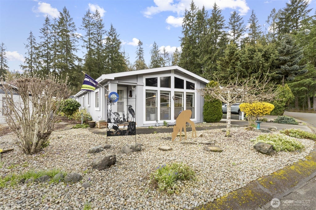 Welcome to Silver Creek Meadows, premier living catering to 55+ residents. This beautifully maintained 2 BR+ home is light and bright with vaulted open living space, floor to ceiling windows, skylights, charming shiplap accents and vinyl plank flooring throughout. Spacious kitchen with stainless appliances. Beautifully updated bathrooms. Finished detached 8'x14' outbuilding with power, perfect for home office, workshop or additional storage space. Quiet tucked in location with 1 car carport plus two additional off-street parking spaces. This lovely 55+ park offers a clubhouse, small golf course, walking trails, tennis courts, horseshoes & RV parking. Close in location, mins to shopping, restaurants and medical.