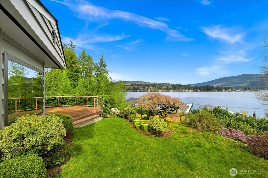 LAKE WHATCOM BEACHFRONT! Approached from a long driveway & perched on a picturesque knoll with 180 degree views overlooking the lake and surrounding mountains. Located in the sought after Geneva neighborhood, this artfully designed 3,600 sqft home is perfectly appointed. Features include an ideal floor plan with two primary suites plus an additional 4 bedrooms/office, 4.5 baths, multiple living areas with 3 fireplaces and a large garage attached by a breezeway. Nicely landscaped level yard with plenty of room for a garden or play equipment. Enjoy the lake lifestyle with nearly 50 feet of waterfront, and improved with a fully fenced level yard, firepit, beach cabana with adjacent deck, bulkhead, dock, and even includes a hoist for your boat!