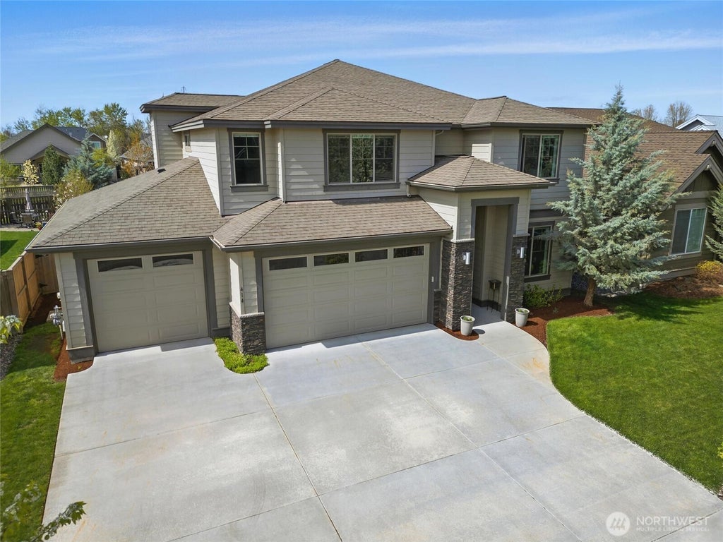 Stunning two-level Pahlisch Home featuring an open-concept design with a spacious great room, gas fireplace, custom built-ins, and oversized windows. The gourmet kitchen offers a pantry, two eating bars, and a dining area—ideal for everyday living or entertaining. Upstairs, a convenient laundry room, bonus room, and 3 bedrooms, including a luxurious primary suite w/ walk-in closet, dual vanities, shower, and soaking tub. Main level features a dedicated office/den that could serve as a fourth bedroom. Outdoor living shines with an extended, partially-covered patio, large fenced yard, and garden space. Oversized 3-car garage offers ample room for vehicles, storage, or workshop. Located in Provenance with creekside trails and vineyard views.