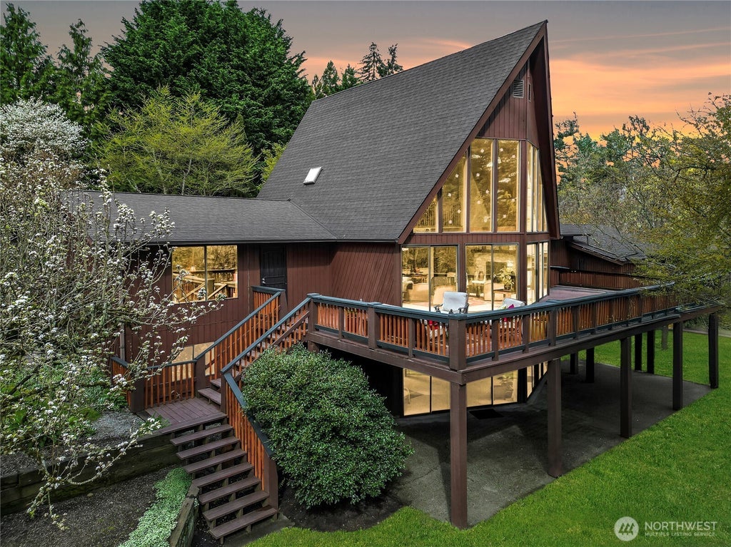Nestled at the end of a private Tacoma road, on a shy 1.5 acres in Tacoma, this stunning 3 bedrooms, 2.5 bath A-frame blends modern comfort with natural beauty. Enjoy mountain views from the vaulted floor-to-ceiling windows or the expansive deck. The remodeled kitchen dazzles with a sky wall window, and the primary loft features an updated bath and open views. Heated tile floors in the bathrooms, the large finished daylight basement, and mature landscaping enhance the home’s appeal. A two-story garage/shop, RV parking, 2-car garage, and heated greenhouse offer ample space for hobbies and storage. Seamlessly connected to local entertainment and freeway access, this special home offers a harmonious balance of convenience and serene living.
