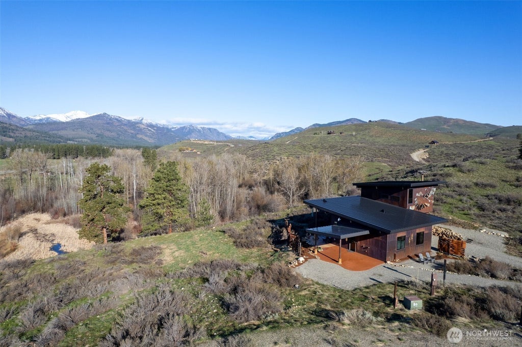 Welcome to Skytop, your Methow Valley dream home. This modern masterpiece offers art-gallery décor, inspiring views and privacy, all within walking distance of Winthrop. One of the Methow Valley’s most popular nightly rentals! The handicap-accessible Skytop wing features a carport, gourmet kitchen & large, wheelchair-accessible bathroom. The adjacent Treehouse Suite includes a large tub and kitchenette. Below is a heated garage/shop with EV hookups. The units have separate entrances, but share an interior wall framed to accommodate a pass-through door. South & west facing views are forever protected by topography. Fire resistant landscaping and building materials used throughout. Skytop comes fully furnished, rental ready, all art included.