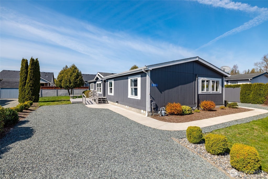 Impeccably maintained & renovated manufactured home in the 55+ gated community of Carriage Estates. Ideally located, minutes to historic downtown, with charming shops, eateries, trails & parks. Bright open design with generous living throughout. Remodeled & reimagined kitchen offers stainless, loads of storage, glistening quartz w/stone tile splash & center cook island. Large dining open to expansive rec-room. Outstanding primary w/spacious walk-in & ensuite bath offers oversized step-in shower. 2 perfect guest bedrooms, full guest bath & sizeable laundry room. Additional upgrades include new roof, LVP, plus energy efficient mini splits for heating & A/C. Easy care landscaped yard w/front sundeck, BBQ patio, fencing & 2 large storage sheds.