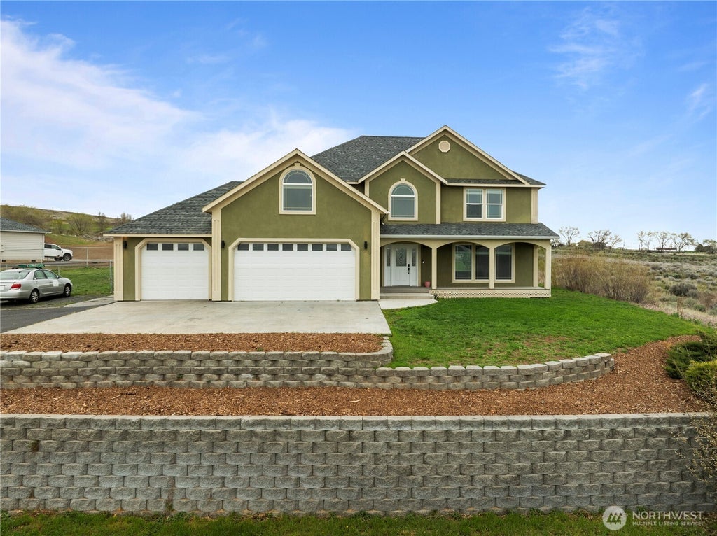 Stunning 2,540 sq ft custom home on 2.24 acres with captivating views of Soap Lake, the city, and striking basalt cliffs. Thoughtfully designed to showcase the scenery, features formal living and dining rooms, a spacious family room off the kitchen with an island, and a dramatic entry with a chandelier, curved banister, and tile flooring. The primary suite includes a walk-in closet and a luxurious bath with a jetted tub, separate shower, and double vanity. Finishes include tile, carpet, and laminate flooring. Enjoy landscaped grounds with underground sprinklers, decorative stone walls, partial fencing, and a 3-car attached garage. Located on a private, county-maintained dead-end road with covenants in place to protect your investment