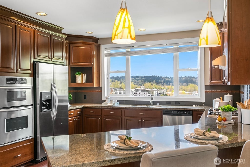 MAJOR PRICE IMPROVEMENT! REDUCED 25K! Turnkey 2 bedroom, 2 1/2 bath Condo with den/office located in an boutique condo community in the heart of Redmond. Enjoy magnificent views and breathtaking sunsets from the kitchen, living room and large balcony. Fabulous gourmet kitchen features stainless appliances, pantry and peninsula for entertaining. Separate dining area. Living room with gas fireplace. Immaculate hardwoods, newer carpet and paint throughout. Beautiful primary suite with spa like bathroom. Soaking tub, double vanity, large walk in closet with built-ins. In-unit laundry with washer/dryer. Two garage parking spaces. Dining, shopping and more within walking distance. This stunning property is pre-inspected and ready for your buyers.