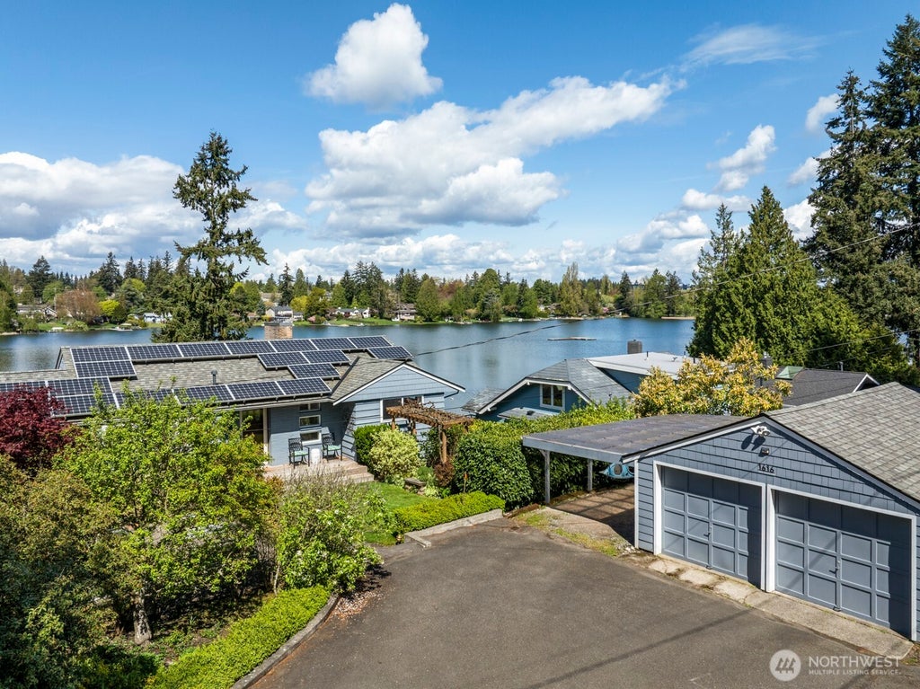 Charming updated daylight rambler w/stunning lake view! Come home to peaceful lake views & watch bald eagles & ospreys soar. This home blends comfort, charm & sustainability. Beautiful hardwood floors +3 fireplaces. Stylish kitchen w/deep custom cabinets, eating bar and pass-through to dining room. Family rm opens to oversized composite deck, ideal for alfresco dining. Lower level bonus room, office, bedroom, ¾ bath, storage & separate entrance—perfect for work-from-home or extended living. Enjoy raised garden beds, fruit trees & berries. Solar panels covers most electric costs. Garage, carport +xtra parking. Tons of windows throughout. Located minutes from St. Francis School, Trader Joe’s, PCC, and bus line. A serene, eco-friendly retreat!