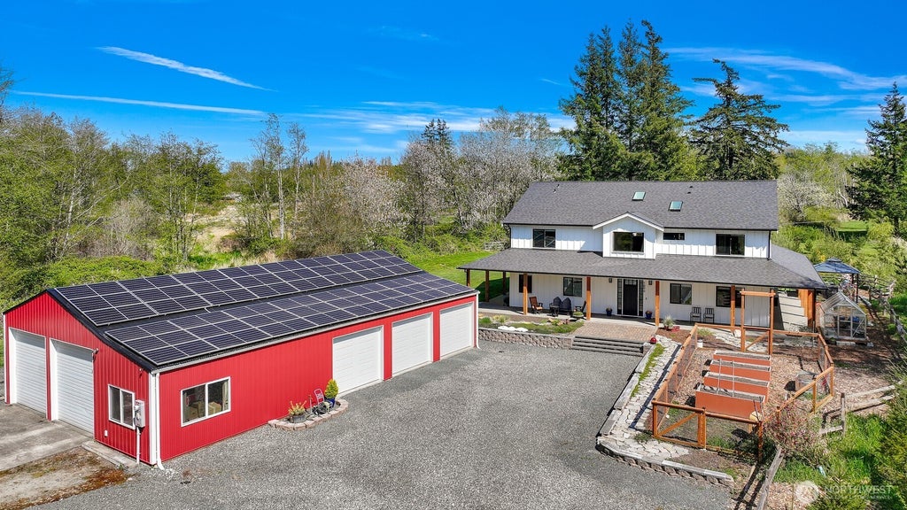 Truly two homes in one! This stunning modern farmhouse by Highline Construction offers exceptional design, energy efficiency, and versatility—perfect for multigenerational living or dual households. With two full kitchens, two spacious primary suites, and thoughtfully separate living spaces, there’s room for everyone. The main kitchen opens to a wraparound porch and covered outdoor cooking area, ideal for year-round entertaining. An ADA-accessible main floor adds everyday convenience, while solar panels, a tankless water heater, and EV charging keep things efficient. Set on private acreage with fruit trees, raised garden beds, and a 2,100 sq ft shop with 220V power—just minutes from Bellingham!