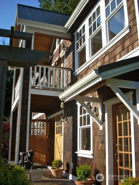 West-facing waterfront on 2.55 private acres with 129’ of tidelands offering stunning sunsets, Olympic Mtn view, and whale sightings. Designed by an award-winning architect, the 2,000 sf home blends Hamptons-inspired charm with modern sophistication, featuring shingled siding, barn doors, wood-framed windows, and exquisite clear vertical grain fir trim. Inside, enjoy 1,000 sq. ft. of finished living space with soaring 35-foot ceilings and 1,000 sq. ft. of semi-finished open space, perfect for customization. Ideal for year-round living, vacation rental income, or conversion to a full-time residence. This property has a primary building site on the bluff with 4-BR septic in place if building a primary home is in your future plans.