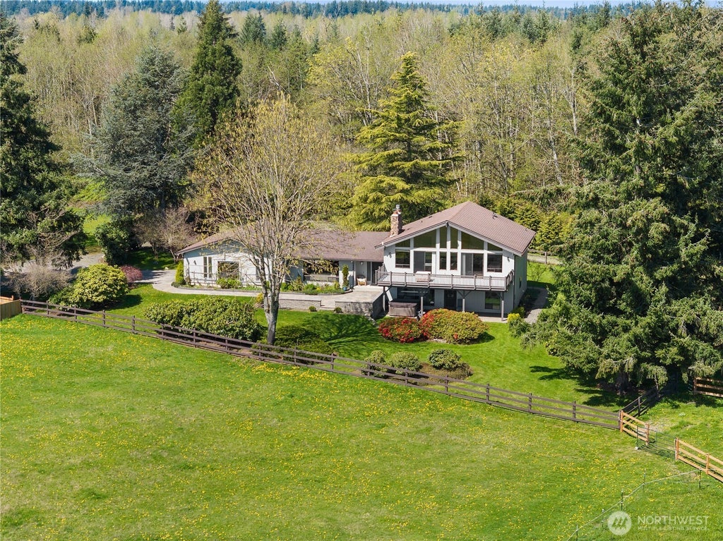 Welcome to this country estate home on 5 fenced & cross fenced acres w/ spectacular Mt Rainier & foothill views! 3,105 SF, 3+ bedrooms (all 3 w/ private 3/4 baths) & a total of 3.5 baths. Updated kitchen w/ SS appliances, & granite countertops. Living room boasts 16’ beamed cathedral ceiling w/ custom rock fireplace, Harman pellet stove & Mt. Rainier as the backdrop. Vaulted primary suite w/ elevated deck access & VIEWS! Lg rec/bonus room w/ kitchenette & 2 flex/office spaces or beds 4 & 5. Mud/utility room. Workshop/hobby room, adjoin the 3-stall barn w/ tack room, W/D, & paddock areas, plus a covered compost/sawdust lean-to w/ tool storage. Forced air heat pump w/AC. Mature landscaping w/ newly installed paver entry & spacious back patio.
