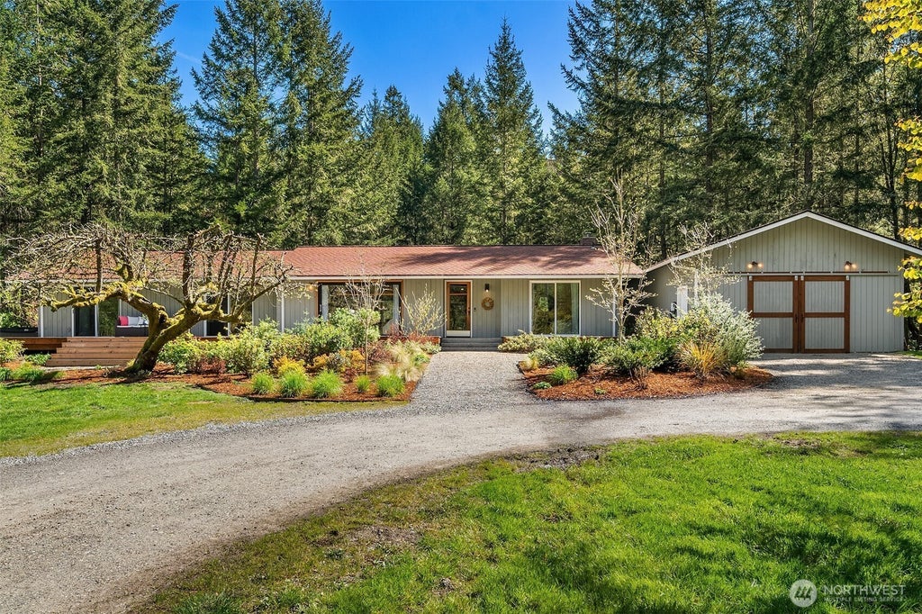 From the moment you turn onto the private driveway in desirable Reddings Beach, you'll know you've found quintessential Vashon Island living. This 1850 sq ft single-level home is fully remodeled with vaulted ceilings, glass sliders for seamless indoor/outdoor flow, a new kitchen and baths, a heat pump with AC, and new ironwood decks overlooking the serene natural setting. It offers 4 spacious bedrooms—all with exterior access—and professionally designed, irrigated landscaping with native plantings. The 1050 sq ft shop provides space for hobbies, storage, a heated office, and two cars. Set on 11 stunning acres—2 sun-filled and cleared, the rest forested for privacy—this turnkey retreat is just 1/4 mile from public beach access.