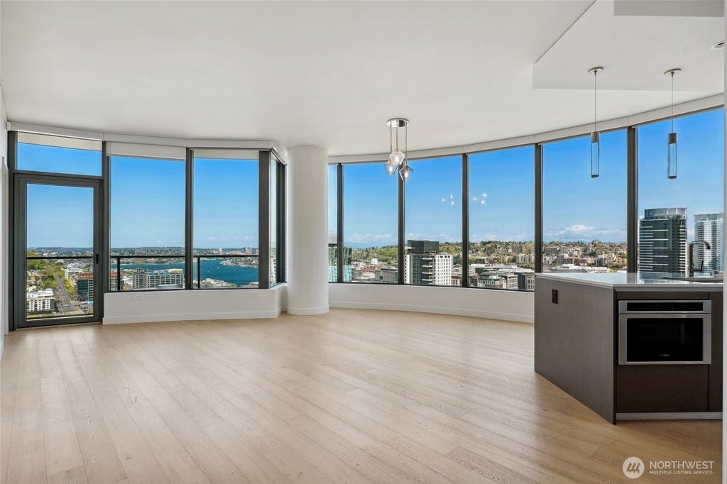 Experience luxury living at The Spire, perfectly situated at the intersection of Belltown, South Lake Union & Denny Triangle. Enjoy unparalleled views of the iconic Space Needle & the water from this unique condo building. This super spacious 2 bed/2 bth corner unit on the 26th floor has generous rounded corner living spaces with a wall of windows offering fabulous views of South Lake Union & the Needle. Contemporary kitchen features large island, Bosch appliances, deck & dedicated parking. Amenities include 24hr concierge, top-floor fitness center, pet run, 40th-floor clubroom, dining areas, terraces, co-working spaces, conference room, theater, yoga studio. Easy access to all things work & play downtown. Ask about buyer credit offered!