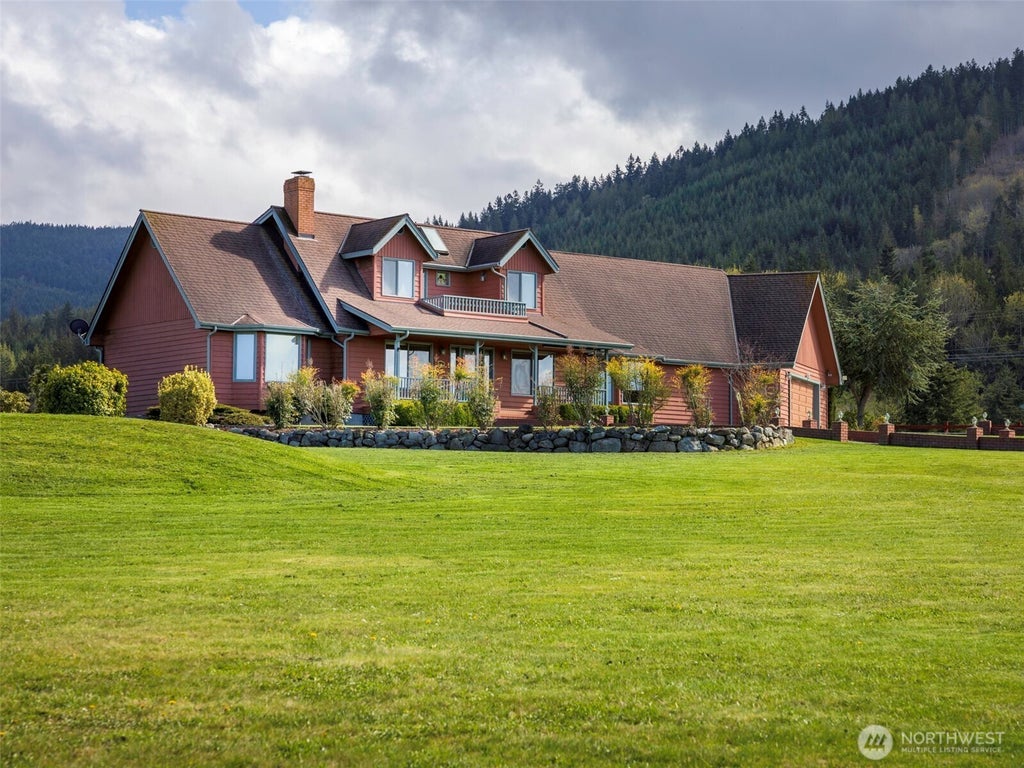 Lovely & spacious cedar home with salt water and valley views in desirable Happy Valley. Remodeled kitchen and primary bathroom, primary bedroom on the main floor, fabulous sunroom, and pellet stove in family room make this home outstanding. Originally builder's own home, so well built with quality and cedar accents, including a cedar closet in primary bedroom. 2 bedrooms and bonus room upstairs, with a full bath. Loads of storage. Large (624 SF) garage with office, plus huge (1250 SF) workshop with potential for guest quarters. Extensive exterior brick work and fountain in front of the house. Gorgeous setting, enjoy the covered front porch where wildlife abounds. Plenty of room for garden, orchard, etc. Well log says it produces 10+ GPM.