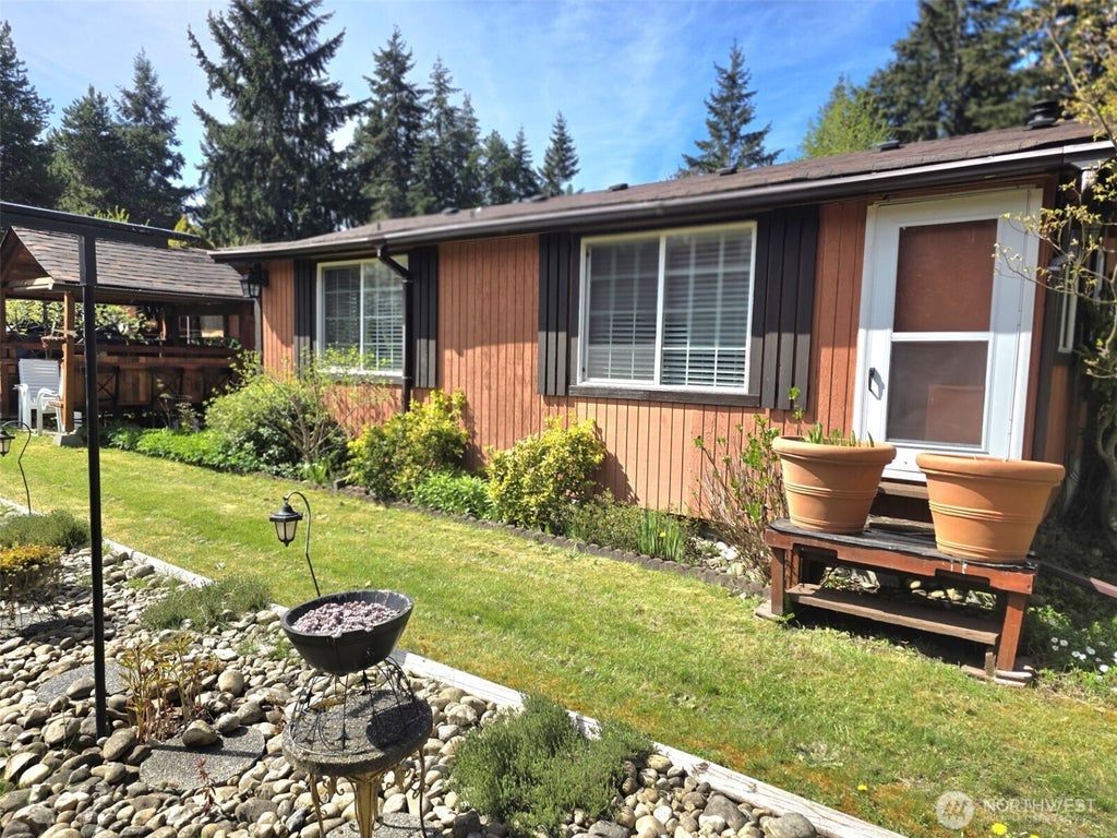 Lovingly cared for mobile in a beautiful setting! Open concept kitchen flows into formal dining room and casual eating area. New windows, flooring and lots of tile counter and back splash upgrades. Detached shop with carport, and a rustic outdoor kitchen out back. Shop has a 1 bedroom with bath unit, walk in pantry and a deluxe sauna! Enclosed side porch, lots of parking space and a pretty gazebo seating area. Gorgeous lot with abundant plants and flowers. Buffered from the street with large trees, this property is its own little oasis!