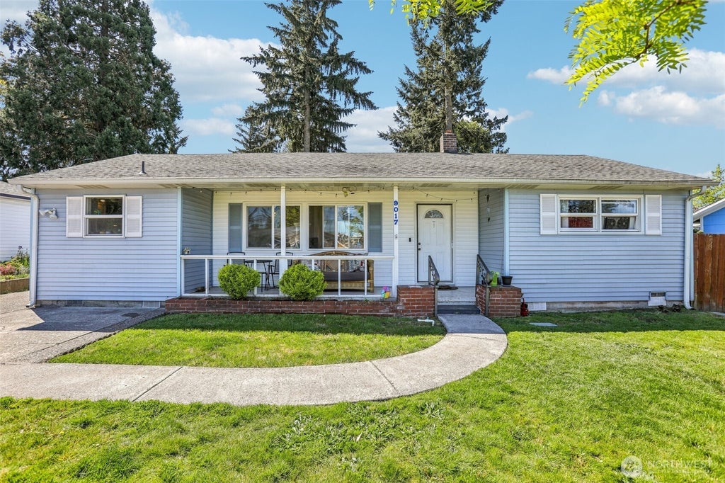 Welcome to this charming home w/covered front porch. Living room w/built-in bookcase, picture window w/backyard views flows into the dining room. Cozy eat bar kitchen w/abundant cabinetry including a lazy susan & built-in pantry, built-in dishwasher, electric range w/hood, & refrigerator. A separate dining nook provides additional space for casual meals. 2 bedrooms each feature a ceiling fan & closet. Laundry/mud room includes a washer, dryer, built-ins, & access to backyard. Full bath w/pedestal sink, combo soak tub & shower. Original hardwood, tile & vinyl flooring. Outdoor living w/back patio & wood-burning brick fireplace, perfect for entertaining. 1-car detached garage, landscaped 7,893 sq ft lot, front sprinklers. Make it yours!