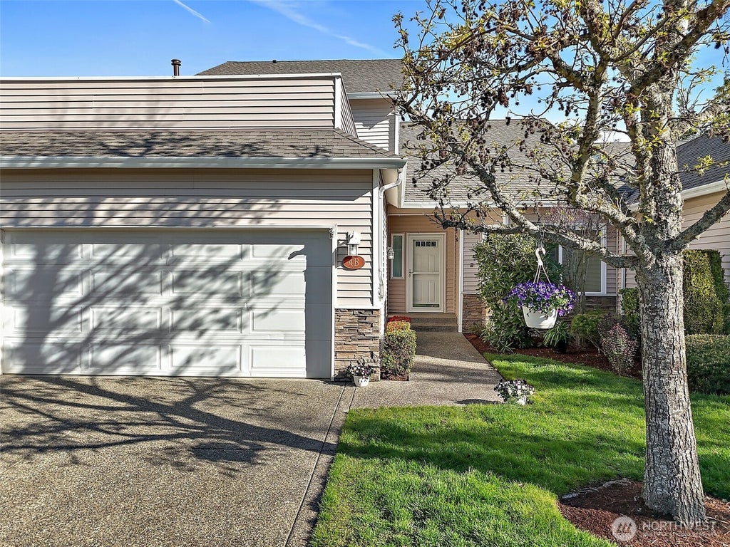 Step into this beautiful home in a gated 55+ community, complete with lush landscaping and a tranquil waterfall. This light-filled 3-bedroom home features an open layout, main-floor primary suite with walk-in closet, dual sinks, and walk-in shower. The great room includes a gas fireplace, white millwork, and access to patio in backyard. Main floor office. Upstairs offers vaulted ceilings, skylights, and a Jack & Jill bath with soaking tub. Enjoy the large patio over the garage—perfect for relaxing or entertaining. Includes tons of storage, 2-car garage, newer furnace, A/C, and all appliances stay. Near parks, dining, and shopping.
