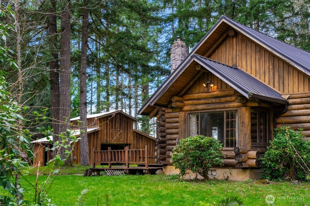 A log home straight from a fairytale, set on 2.5 acres of flat, usable land. This 1,340 sq. ft. home features 3 bedrooms, 2 bathrooms, vaulted ceilings, and a dramatic floor-to-ceiling stone fireplace. Large windows throughout offer a peaceful connection to the outdoors. The property includes a 1,152 sq. ft. detached shop, a solid 4-stall horse barn, gated entry, and a durable metal roof. The vaulted primary suite opens to a private deck. Ready for updates and sweat equity, this is a rare opportunity to create your vision in a truly special setting—just five minutes from Hantwick Trailhead and Battle Ground Lake.