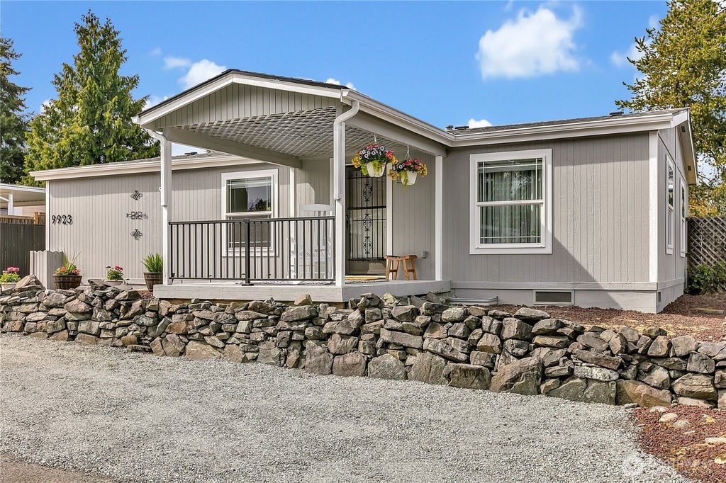 Discover easy living in this spacious 2-bedroom, 2-full bath home with a zero-step covered front porch and entry for ultimate accessibility. The open-concept floor plan is filled with natural light and features a heat pump with AC, updated lighting, fans, and drapes. Enjoy a fully fenced backyard with low-maintenance landscaping, a large patio, and a detached garage with workshop. Ample parking, 3 cars behind the gate and 3 out front! Recent upgrades include a new roof and fresh interior and exterior paint. All appliances stay, making your move-in a breeze! Minutes from parks, shopping, and more! This home is part of a private community with a playground, FREE RV storage, and a large community center.