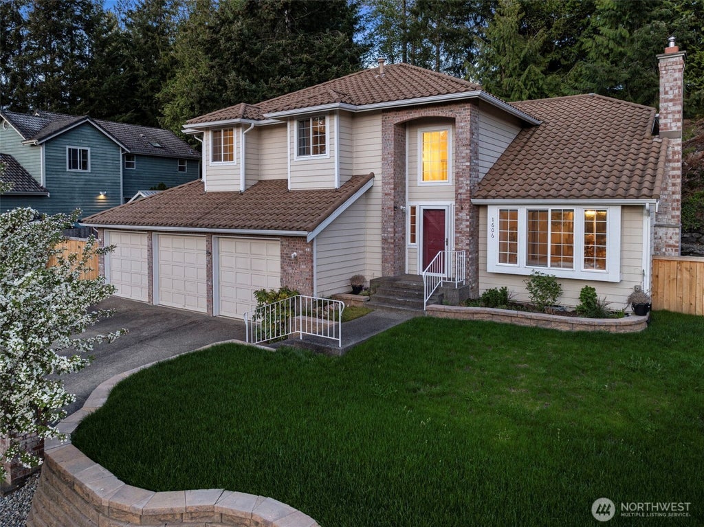 Rare opportunity in quiet Manorwood North! This light-filled, well-maintained home features soaring ceilings, abundant windows, and a spacious layout. The living room flows into the formal dining area and a large kitchen with ample storage. The adjacent family room includes a cozy brick gas fireplace and overlooks a fully redone, professionally landscaped, park-like backyard—leveled for full usability. Upstairs offers a generous primary suite with double doors, a 5-piece bath with jetted tub, and a walk-in closet, plus three more large bedrooms. Brand new A/C, no HOA dues, and walkable to two schools. Minutes to freeways, shopping, dining, parks, and both Sounder train stations.