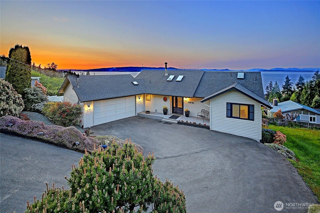 Enter the front door of this Camano home and your greeted with unsurpassed and unobstructed panoramic views of Mount Baker, Utsalady Bay, Whidbey Island, San Juans, even the Canadian Cascades in the distance as well as amazing sunsets. Conveniently located on Camano's north end in the popular Buena Vista neighborhood, this home is 2183 sq ft with comfortable and complete main floor living, 2 bedrooms including the primary and ensuite with utility, living area, great kitchen featuring the efficient triangle workspace design, dining area, powder bath and 2 car garage all on the main level. Lower level includes another bonus living area, 3/4 bath, large office/flex with Murphy bed with its own view deck and 330sq ft workshop and storage room..