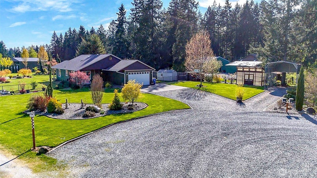 Summertime Entertaining begins here! Garden spaces, landscaped fenced lot, beautiful settings, oversized covered patio, large outdoor patio with fire pit, chicken coup/large chicken run, Greenhouse, RV parking/Carport, garden shed, & ample parking. Amazing luxury plank floors throughout, vaulted ceilings, custom cook's kitchen w/ granite counters, formal dining rm, bright entry, great room w/access to covered patio, primary suite offers spacious 3/4 bath, double sinks, granite counters, tile floors, & large walk in closet. Wood trim, open floor plan, laundry rm w/ storage, & two car garage.. Sprinkler system has 18 stations for keeping your landscaping gorgeous. Imagine Summer BBQ's, Cornhole, Badminton, & Bocce ball on this level acre lot.
