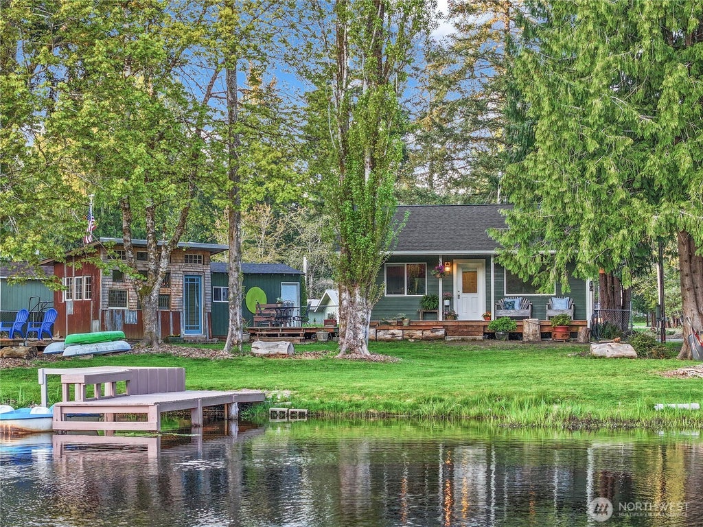Welcome to your dream escape! This darling cabin, built in 2012 and beautifully maintained, sits on an impressive 148 feet of no-bank lakefront—perfect for swimming, paddleboarding, or simply soaking up the views. Whether you're looking for an affordable full-time home or the ultimate summer lake house, this place has it all. Enjoy plenty of space for guests with RV parking and a bunkhouse that has a pullout bed. The back yard is ready for summer BBQ's. A tranquil fountain in the lake adds to the peaceful vibe and helps keep the water fresh. Plus, with the lake stocked twice a year, fishing fun is practically at your doorstep. As part of the Timberlakes community, you also get private access to Puget Sound for saltwater adventures!